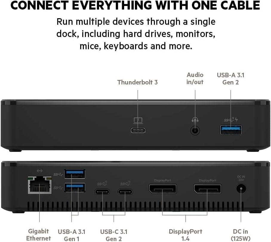 Fast, powerful, and now even more versatile, meet the Thunderbolt 3 Dock Plus – offering universal compatibility and bringing all the benefits and convenience of Thunderbolt 3 technology to both Mac and Windows laptops. With 40Gbps transfer rates,* 60W power to charge your connected laptop, dual 4K 60Hz monitor support and multiple ports for peripherals, simply connect the dock to your laptop with the included Thunderbolt 3 cable to create a high-performance, instant workstation.